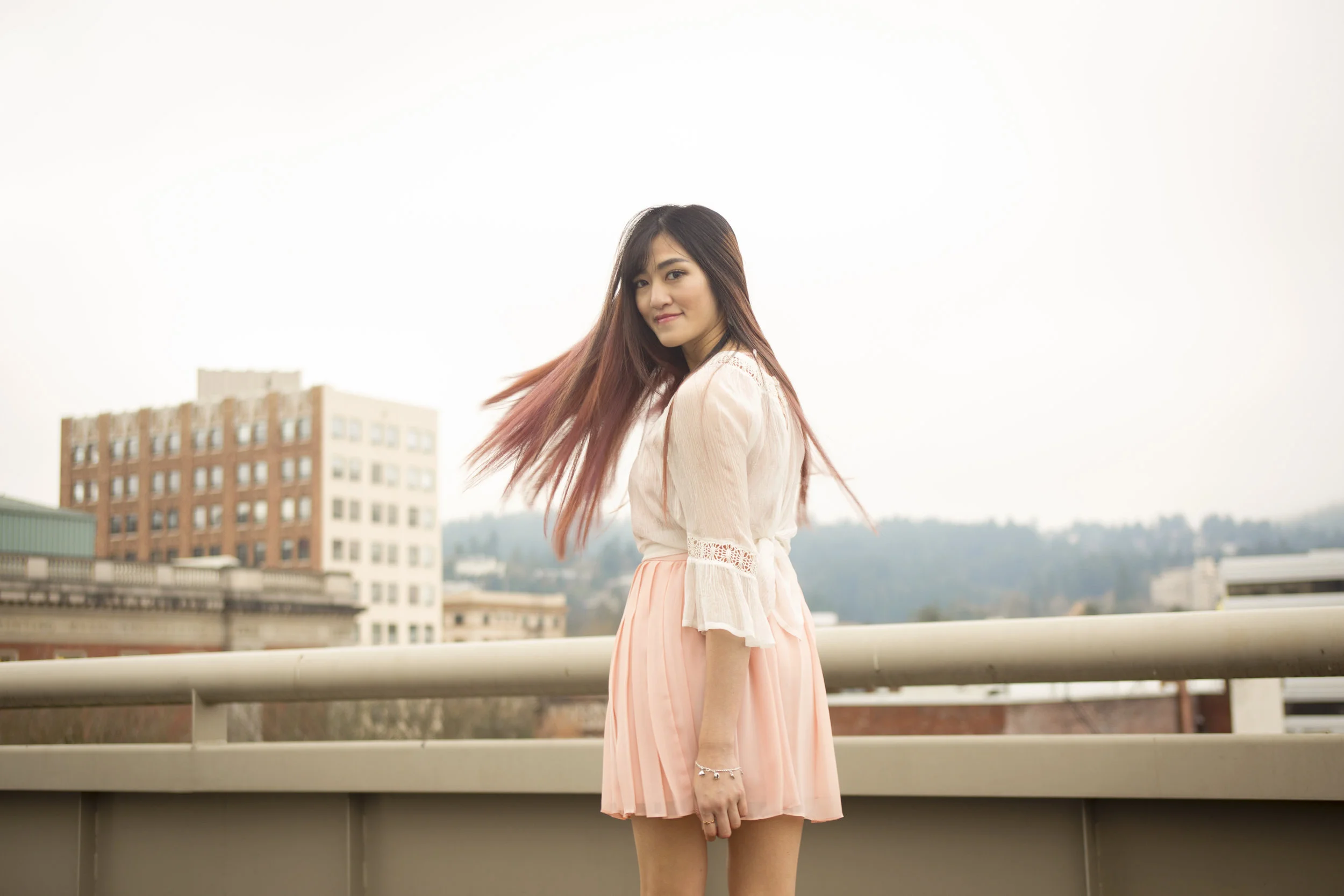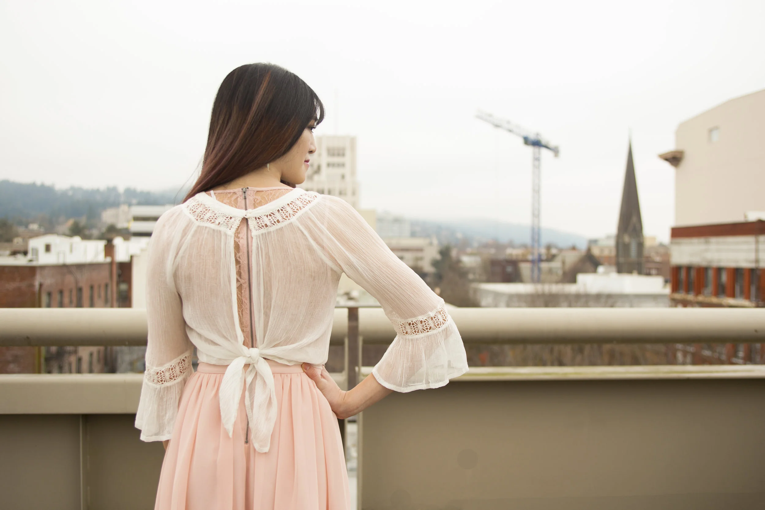 I am wearing a soft pink, lace pleated dress from BCBGeneration that I am just in love with. The dress flirts and teases with lace but keeps all of the mystery in the look. Adding a sheer top from Urban Outfitters, the flair sleeves keeps the look on trend for all my high fashion gals yet is a light add on. Tying the back will add a whimsical touch and cinches in the waist.